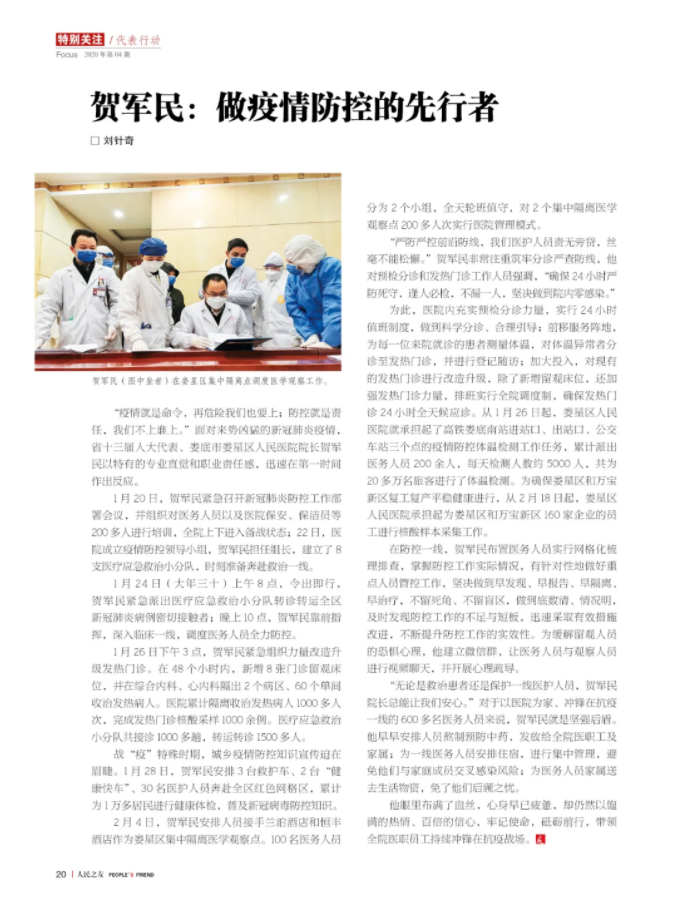 1月20日,贺军民紧急召开新冠肺炎防控工作部署会议,并组织对医务人员以及医院保安、保洁员等200多人进行培训,全院上下进入备战状态;22日,医院成立疫情防控领导小组,贺军民担任组长,建立了8支医疗应急救治小分队,时刻准备奔赴救治一线。