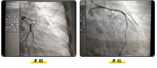 经过约1小时紧张有序、争分夺秒的手术操作,以彭描宇主任为主的心内科手术团队成功将患者冠脉打通,在患者左主干及前降支植入两枚支架,支撑起闭塞的血管打通了生命线,患者胸痛症状马上有了明显改善。对照术前术后两张造影片,参加抢救的工作人员才长长地舒了一口气,紧张有序的抢救工作也告一段落了,他们疲惫的脸庞上终于露出了笑容。