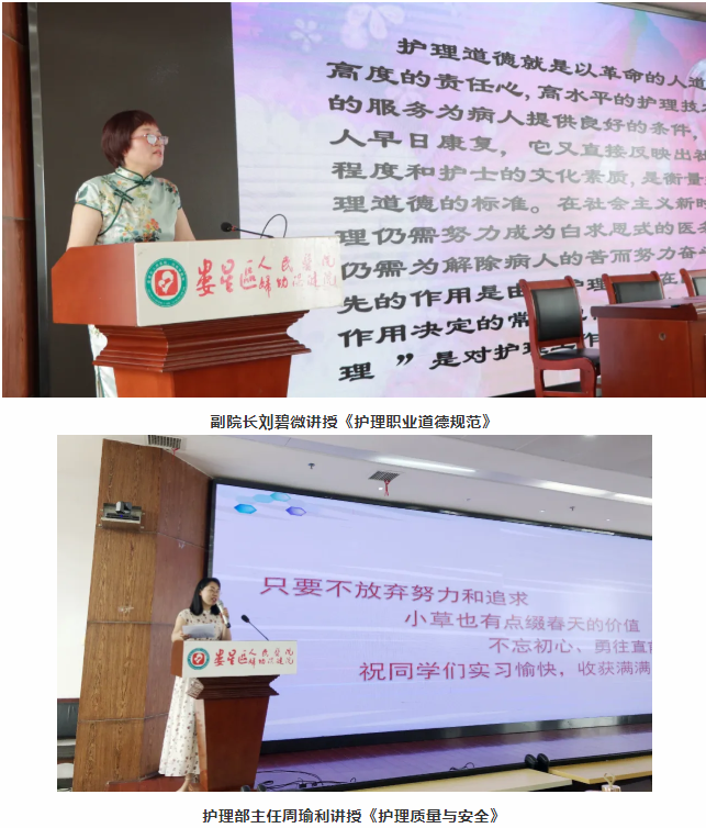 7月2日,在护理实习生岗前培训开班仪式上,医院副院长刘碧微首先对大家前来医院实习表示热烈欢迎,并向大家介绍了医院的发展历程,同时结合自身的成长经历与大家分享了如何才能成为一名优秀的护士,她告诫大家实习的过程不仅仅是学习理论知识与操作技能,如何学会与病人、病人家属、带教老师及同事沟通和相处也尤为重要;在工作中要有吃苦耐劳的精神,不能拈轻怕重,只有潜心学习做人做事,才能真正在实习的过程中得到收获。
