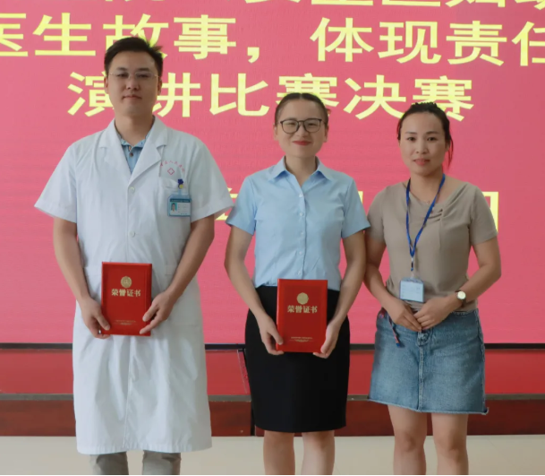 副院长兼大儿科主任易赛君(右)、副院长刘碧微(右三)、医务科科长谭永利(左)为三等奖获得者颁奖并合影