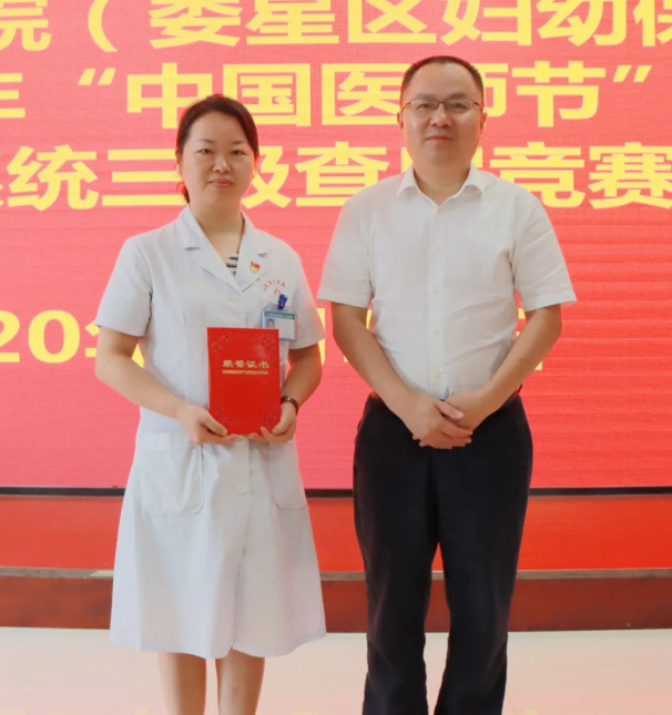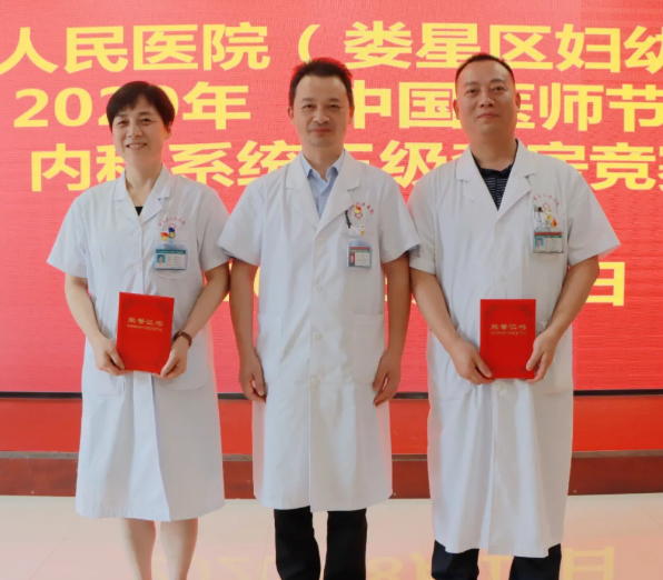娄星区卫健局党组成员、医院院长贺军民为荣获一等奖的老干诊疗康复中心团队颁奖并合影