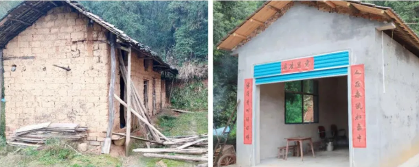 42岁的贫困户刘永根 ,育有一女,配偶离家出走(精神残疾),他因茶耳(耳窝化脓)导致听力三级残疾,基本无听力,没有住房,一直与年迈的父母挤在一起,住的土砖房已是破破烂烂,经常漏雨,根本不能居住。因身体原因,没有能力自主建房,看着家里的破房子也是无能为力,住所问题成了压在他心里的一块大石头。帮扶工作队与村支两委了解到情况后,为他协调解决实际困难,联系万宝镇政府,落实成为危房改造对象,按照专项资金标准进行补助,医院还投入1万元资金对他进行帮扶。今年6月,刘永根终于有了属于自己的房子。