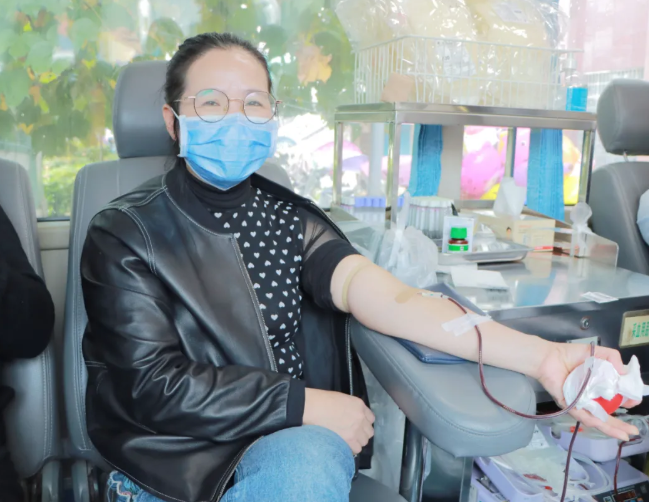 保健部杨瑞玲的爱人谭周明累计献血量达10000毫升,而她本人也献血6次,累计2400毫升
