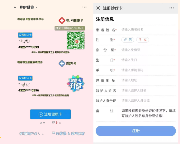 第二步:选择门诊----我的健康卡----没有绑定院内诊疗卡时直接注册健康卡(有绑定时直接进入下一步),填写注册信息,打星号的为必填,信息必须真实正确且与就诊者一致。