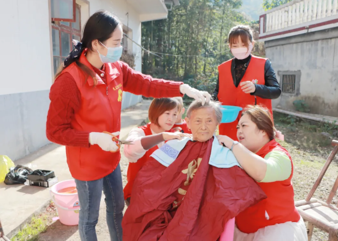 91岁的特困供养贫困户曾求前,儿子已过世,但在党和政府的关怀下,生活安逸,当志愿者们到家中帮助她打扫卫生、洗剪头发时,她激动的说:“活到现在这个年纪,还能过上这样的晚年生活,真的做梦都想不到啊!感谢党和政府,感谢你们啊!”志愿者们与曾奶奶拉家常,让老人家享受到了“天伦之乐”。
