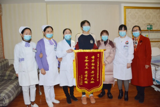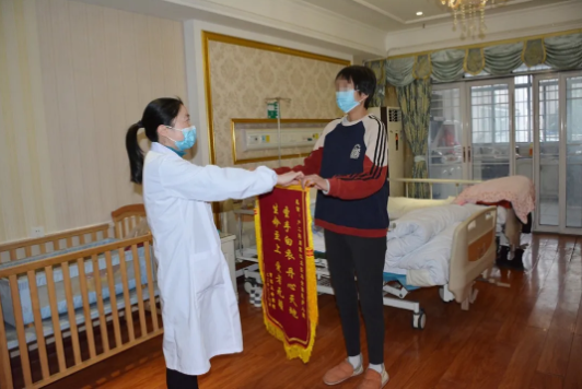 出院时,小清一家人给产二科医护团队送上一面锦旗,感谢医护人员这种生命至上,爱者无疆的举措和精神。