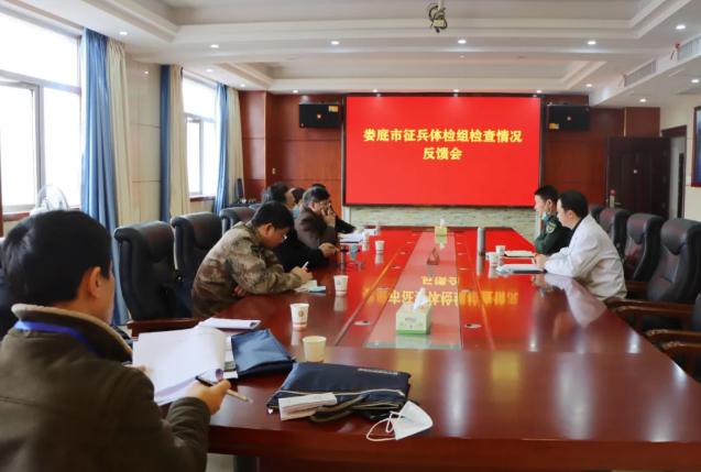 随后,检查组一行在医院14楼会议室进行反馈。刘智勇和邹自平两位就娄星区2021年春季征兵体检工作的安排部署、疫情防控情况进行了汇报。