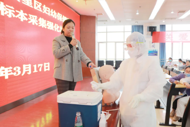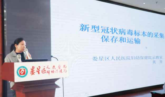 培训会现场,示教室主任黄青通过图文结合的方式,从新冠病毒标本的采集、新冠病毒标本的规范保存、新冠病毒标本的运输等三个方面,详细讲解了《新型冠状病毒呼吸道标本的采集、保存和运输》;并现场进行核酸采样流程演示。
