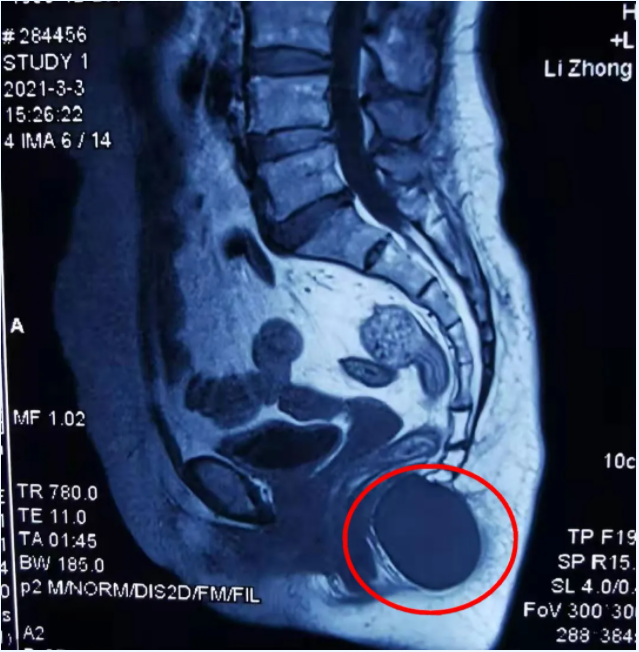 曾女士在家人的陪伴下辗转多家医院,均考虑是混合痔,但吃了一段时间治疗痔疮的药后也未见好转,直到在市内一家医院做了核磁共振检查,看结果才发现曾女士的尾椎下方有一个4cm*4cm如鸡蛋大小的肿块,已经压迫到直肠和骶尾神经,必须马上进行手术切除。但由于肿块太大,周围的神经、血管丰富,手术难度相当大,辗转几家医院都不敢为她动手术,此时曾女士更急了……