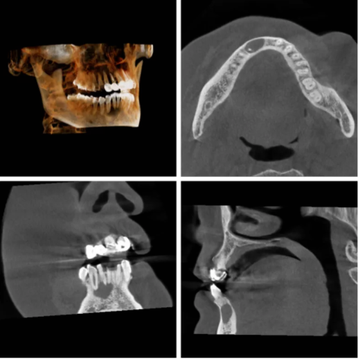 口腔CT可以从三维角度对组织情况进行反映,可以发现口腔X光片的投照角度不能发现的、或者更细微的病变;它的三维重建效果能够对骨组织情况、下颌关节情况进行准确评价,协助医生进行手术前方案设计,以及术后科学评价。