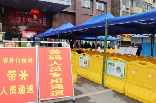 采样现场设有信息登记处、核酸采样处,留观处,在醒目位置清晰可见“黄码”人员专用通道出入口指引牌。