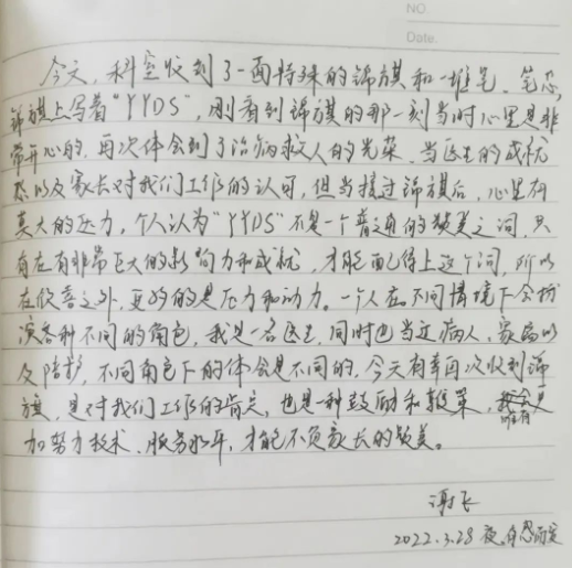 而今,宝宝1岁多了,因为肺炎再次住进了儿一科,经过治疗后,明显好转,宝妈为表达谢意,送来了这封特殊的感谢信和一支支满载信任的笔。