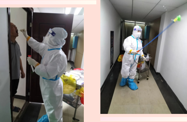 组织的信任,家人的支持是我工作的最大动力。可能大家看到我们的工作只有消杀、核酸采样、测温、送餐服务,实际上我们还有信息登记、物资储备、医疗指导、数据报送、心理疏导、生活保障等工作,琐碎而又繁杂,每天工作接近20小时。仅仅消杀一项,每天对整个楼层房间进行全方位、无死角消毒后,还要进行环境采样,整个完成下来要五六个小时。我们经常是每天早上6点就起床开始工作,要忙到凌晨两三点钟才能休息。