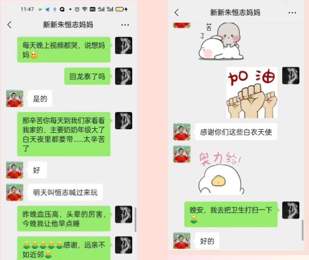 我家情况特殊,丈夫是人民警察,现在因为疫情需要闭环管理,至今已有20多天没有回家了,大儿子还有2个月就要参加高考,小儿子还只有5岁,正是闹腾的年纪,照顾孩子的重任就落到了73岁的奶奶身上,老人有高血压,血压不稳定,我很担心这么长期的“保姆”工作会让她吃不消,所以只好经常厚着脸皮发信息给邻居请求每天都帮忙去家里看看情况,关注老人的身体状况。作为媳妇不能承欢膝下,我非常愧疚,幸好我婆婆很支持我的工作,让我安心在前线抗疫,内心很感激。