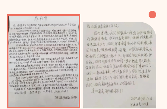 “您好,小超(化名),我是桃子姐,之前你说没带睡衣,我们给你送来了,还带了点其他生活用品,你看够不够?”在手头工作暂时告一段落的“闲时”,黄陆桃终于可以把早就替旅客们准备好的各项物资送到他们手上。才几番接触,她就与旅客们相熟,像老朋友似的陪伴他们左右。而身在异乡却感受到浓浓关爱的旅客们也不知何时问“大白”们要来了笔纸,坚持要以最传统的方式,一字一句写下心中的无限感动与无尽感谢。“这些信太珍贵了,这份信任与温暖我们会永远记在心里,也会化成我们继续前进直至胜利的动力!” 当收到这些“特殊的”来信后,黄陆桃和同事们眼眶也漫起了水雾。
