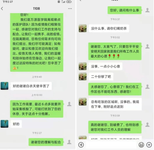 密不透风的防护服阻隔着可能潜在的新冠病毒,却无法阻隔爱与温暖;在黄陆桃的带领下,隔离点的医护人员不仅严格遵守防疫安全措施,还成为了隔离人员的心理“辅导员”,为确保隔离人员隔离期间的安全和身心健康,医护人员会通过电话或者微信了解他们的生活和心理状况,以便随时进行心理安抚,缓解他们的紧张情绪。