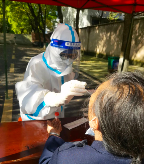 中午十二点半,党员干部们和医务人员已经身着防护服,全副武装驻扎到了各核酸采集点,他们准备就绪后,有条不紊地进行核酸采集工作,防护服下他们彼此分不清楚谁是谁,唯有一个共同的名字,那就是“核酸采样队员”。