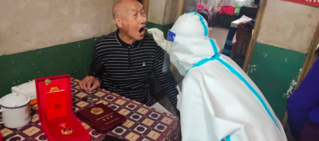 长青社区湘运公司核酸检测点上门为90高龄抗美援朝老战士夫妇做核酸采样