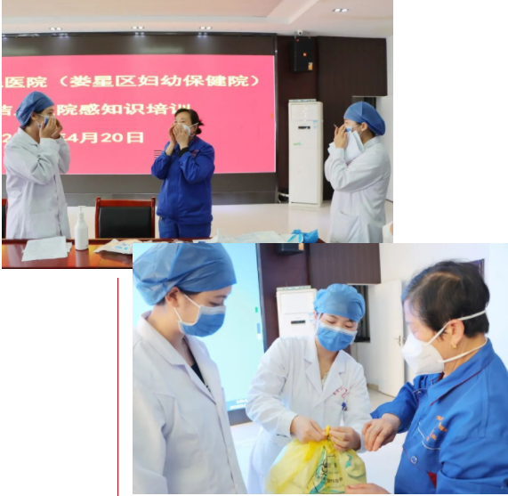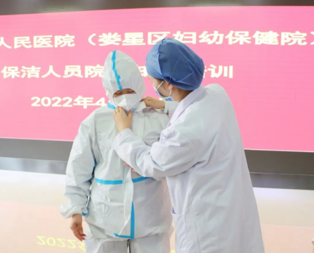 为提高保洁、保安人员的感染防控意识,有效落实各项感控措施,杜绝院内感染发生,4月20日,娄星区人民医院(娄星区妇幼保健院)再次对医院保洁、保安人员分别进行院感防控知识、七步洗手法、佩戴口罩和穿脱防护服专项培训。