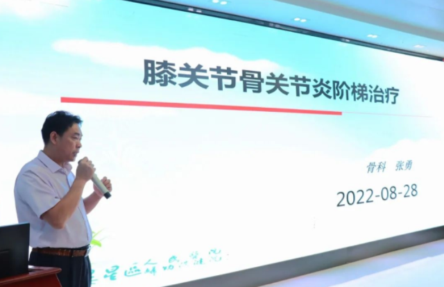 骨科/康复理疗科主任张勇以《膝关节骨关节炎阶梯治疗》为题详细讲述膝关节骨关节炎的阶梯治疗,即在不同的病情,不同的病程发展阶段,采取不同的治疗方案,可以取得较好效果。主要分为早期治疗、早中期治疗、中晚期治疗、晚期治疗四个阶段。早期治疗以锻炼+理疗;早中期治疗锻炼+理疗+药物;中晚期治疗以手术治疗为主,如关节镜下清理术,胫骨高位截骨术,不均匀沉降术;晚期治疗也是以手术为主,如膝关节单髁置换术,全膝关节置换术。同时告诫大家要使用科学合理的方法对膝关节骨关节类疾病进行预防、治疗,在平时的生活中要适量运动、合理饮食、保持良好心态,才能拥有健康的身体。