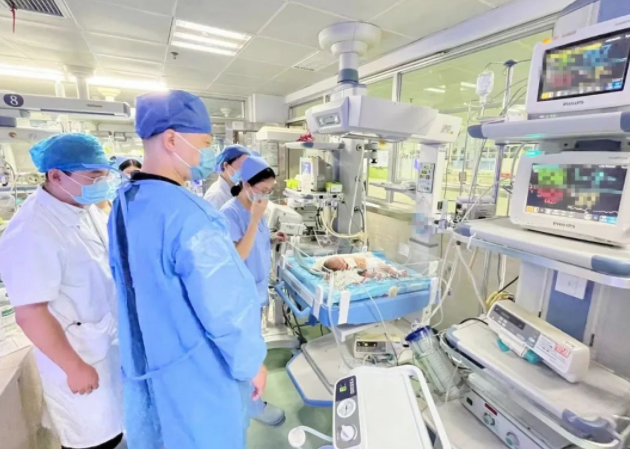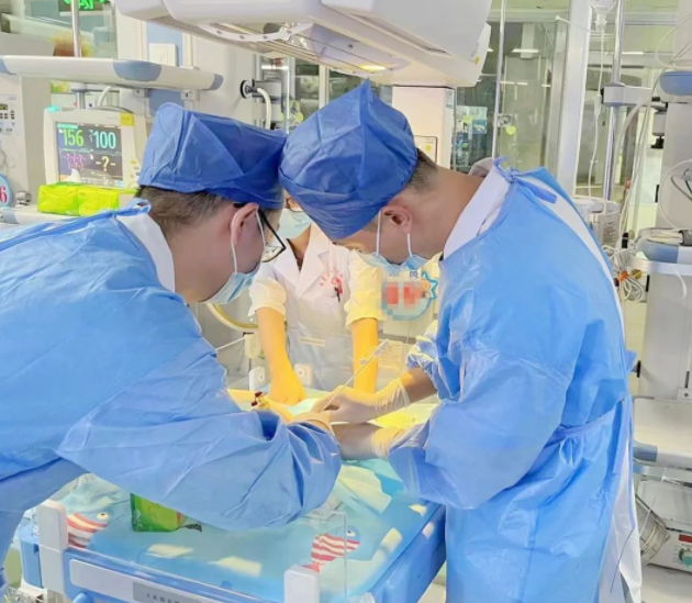 医护团队在易赛君、童霄的带领下,紧急调整抢救计划,及时有效的采取一系列针对性措施,扩容、纠酸、上升压药,一小时监测一次血压,清理呼吸道……呼吸急促、缺氧,复查胸片,胸片结果提示患儿,右侧出现大量气胸并有纵隔气肿!发现这一情况后,新生儿科立即请外科副主任刘建东会诊,迅速行胸腔闭式引流术,并将呼吸机调至高频震荡模式,氧浓度调高至100%……经过一系列的抢救治疗后,患儿呼吸急促较前明显缓解,血氧饱和度维持在正常范围。