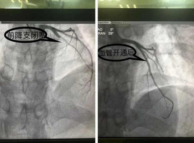 “手术台上,我们造影发现患者前降支在对角支开口后完全闭塞 我们用导丝穿过了闭合段,然后用球囊扩张了狭窄的部位,把血管开通了之后发现是严重的局限性狭窄,狭窄程度达到99%,如果再晚几分钟,基本上很难救过来”彭描宇说道。