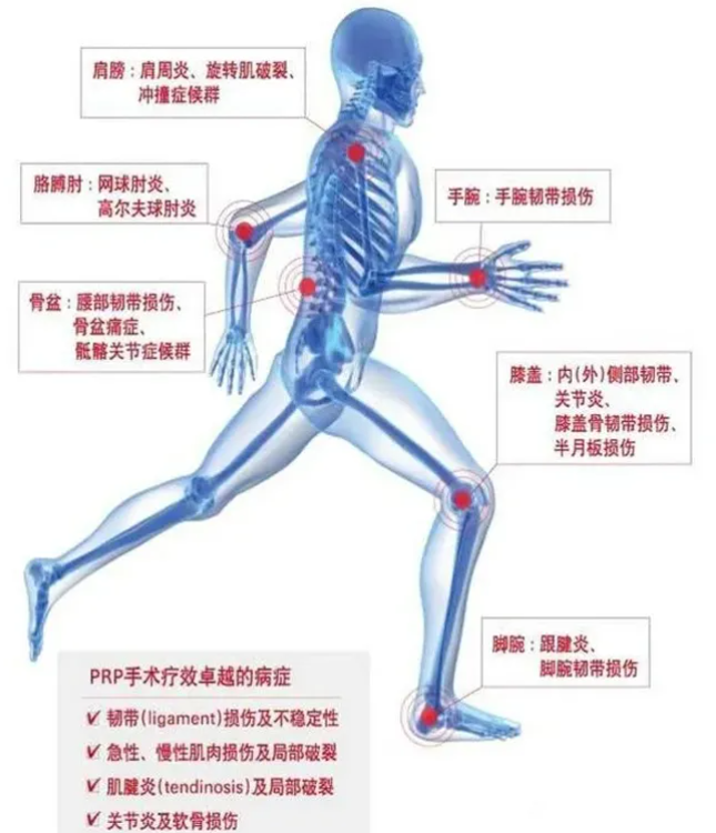 PRP技术治疗各种膝关节炎、滑膜炎、类风湿等,具有绝对的安全性、有效性,具体包括骨关节炎,膝关节骨性关节炎,退化性关节炎,急性慢性肌腱炎,慢性肩痛,肌腱及韧带扭伤拉伤,足底筋膜炎,网球肘、高尔夫球肘、跟腱炎等。